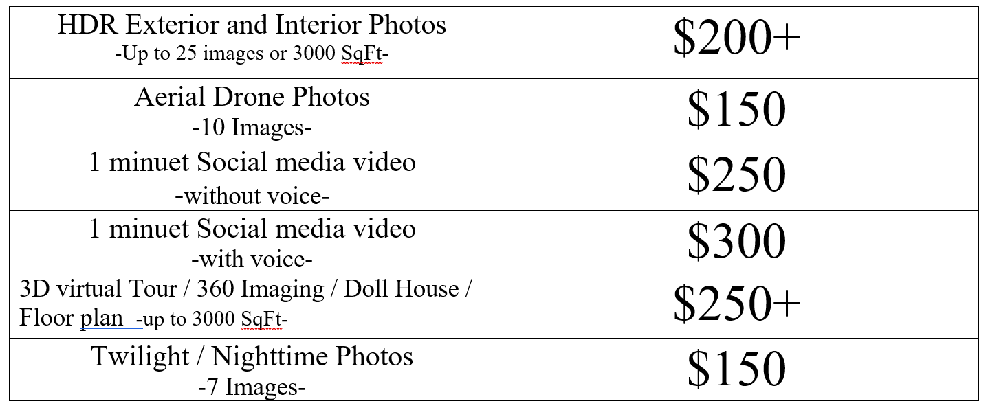 Fully edited high definition HDR photos, Drone photos and video, Social Media Videos, state of the art 3D imaging walk through and much more!